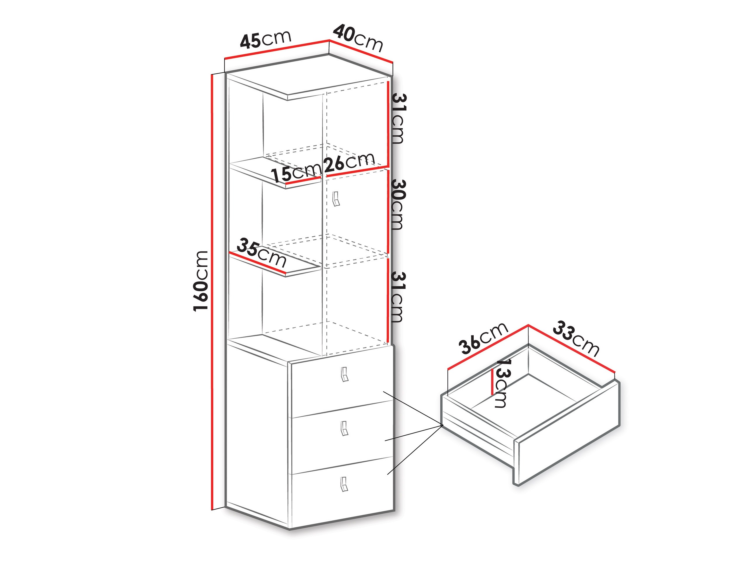 Bij het inrichten van een kamer voor een kind of jongere moeten we ervoor zorgen dat het meubilair zo praktisch mogelijk is en voldoet aan de verwachtingen van de jongere. Dit is precies wat je vindt in de meubelcollectie voor de jeugdkamerruimte. Als de collectie in een paar woorden zou moeten worden beschreven, zou dat zijn: modern en praktisch. De indeling van de kasten en laden wordt nog versterkt door het kleurenpalet. Als je nog aan het overwegen bent welke kleuren je in de kamer wilt, zullen de twee kleurencombinaties je helpen om sneller te beslissen. Met de combinatie van wit, eiken en turquoise creëer je een helder en speels interieur aangevuld met een turquoise accent. De combinatie van zwart, eik en beige creëert een contrasterend en tegelijkertijd elegant ontwerp. De gevels van de meubels worden aangevuld met kleine metalen handgrepen. De vele vakken helpen je georganiseerd te blijven en bieden plaats aan al je belangrijkste spullen. In de collectie vind je een extra ruime hoekkast, bureau, bed, plank en meer. De meubels van de collectie zijn ontworpen en aangepast voor een jong persoon. Er is nog één stap over naar de droomkamer: kies de meest populaire kleurencombinatie.