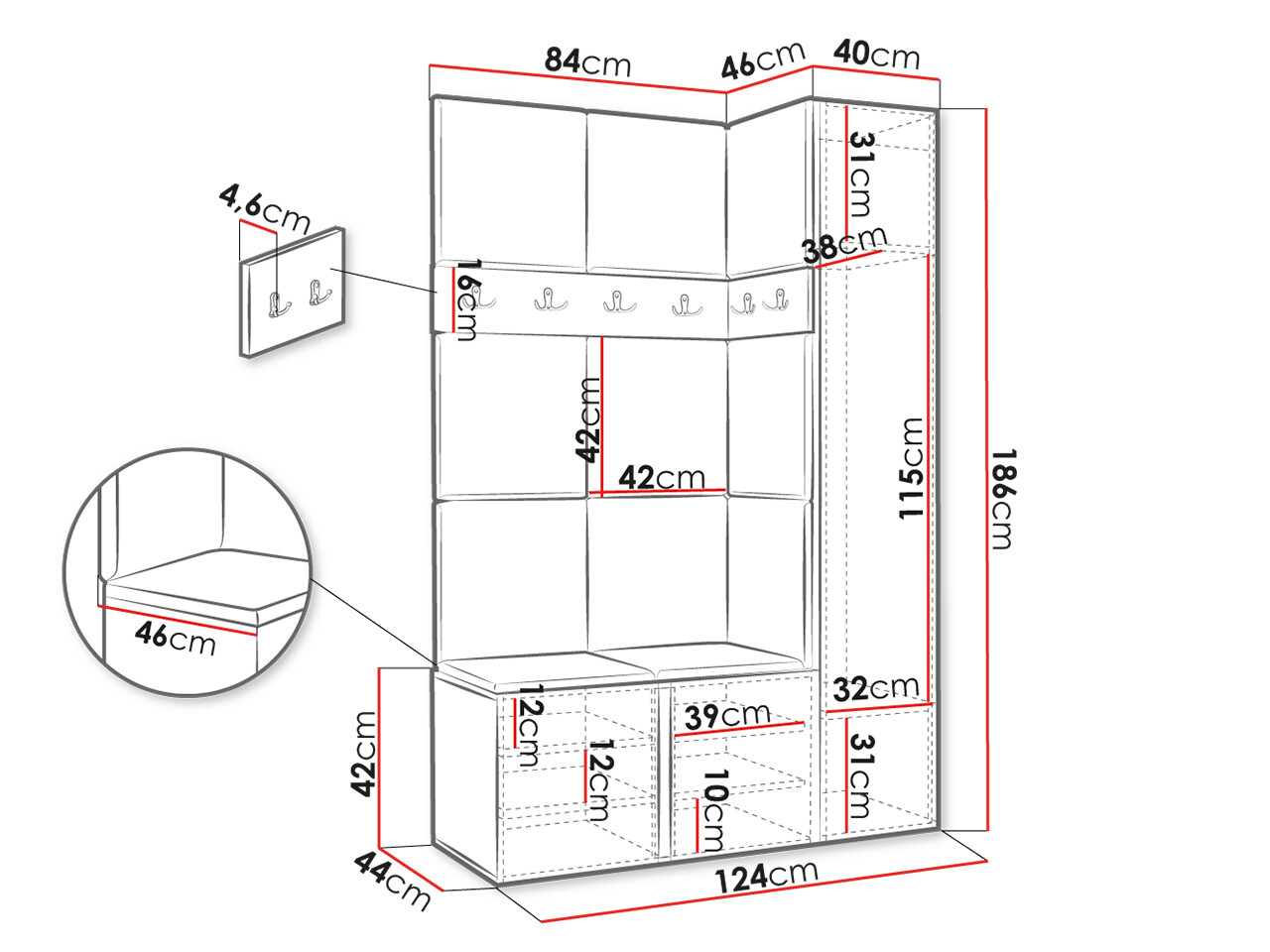 186 x 40 x 46 cm