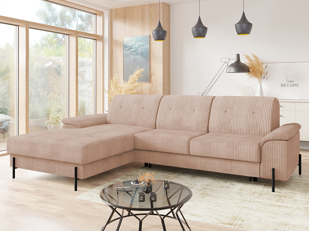Kijk je frontaal naar de bank, dan bevindt het verlengde deel van de linkeroptie zich links van u. De gekozen hoekoptie moet de doorstroming van de ruimte verbeteren en ervoor zorgen dat je je gemakkelijk door de ruimte kunt bewegen.