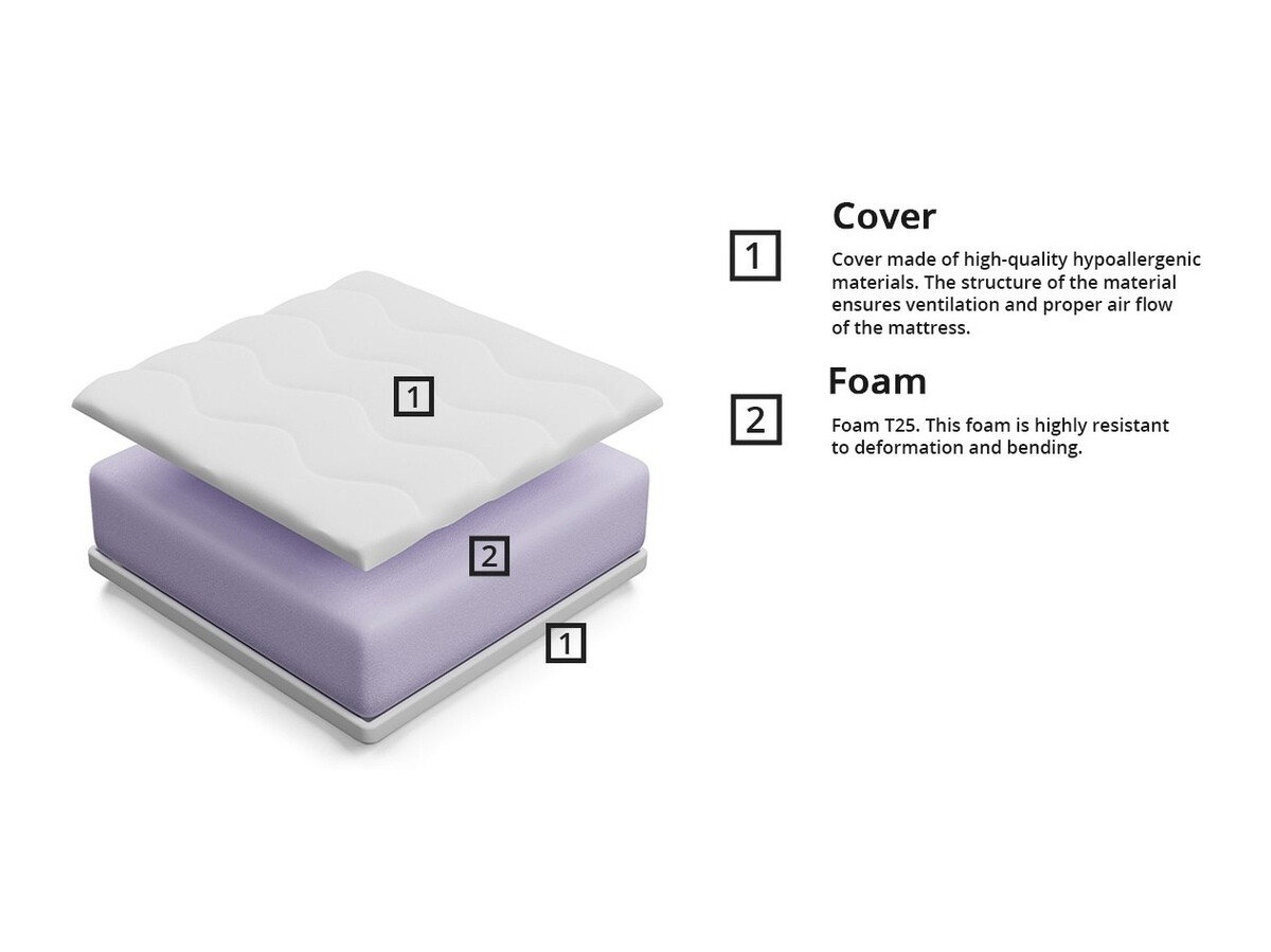 Polyurethaan of schuim is een uiterst licht materiaal dat het lichaamsgewicht gelijkmatig verdeelt en helpt de wervelkolom in de juiste positie te houden. De hardheid en elasticiteit zijn rechtstreeks afhankelijk van de dichtheid. De dichtheid van T25 polyurethaanschuim is 25 kg/m³, wat betekent dat de matras steviger is en de wervelkolom sterker ondersteunt. Dit type polyurethaanschuim is beter bestand tegen vervorming.
