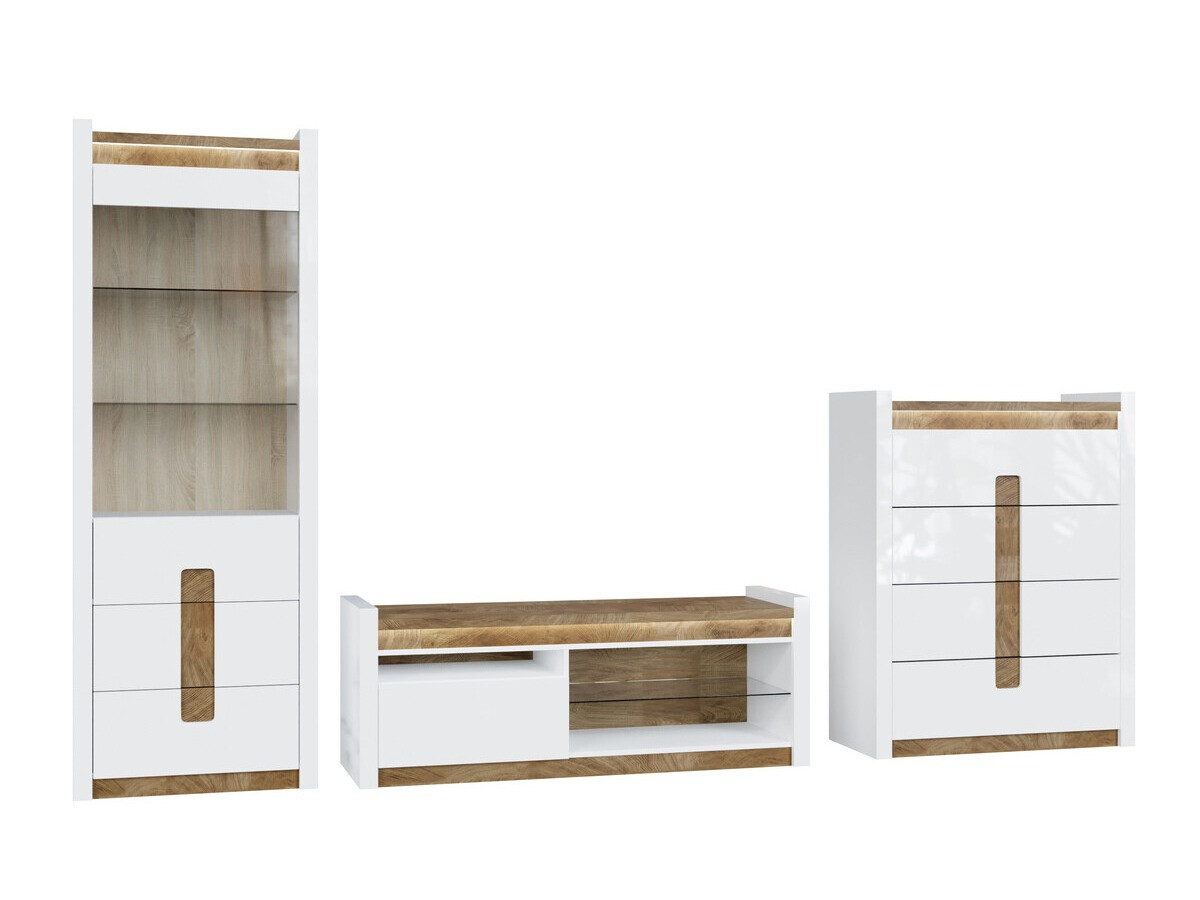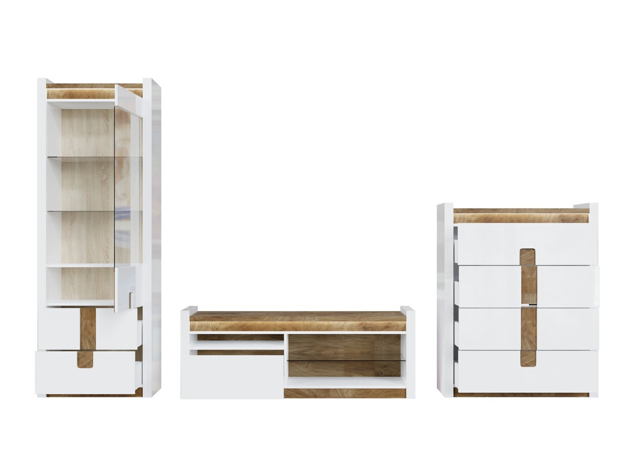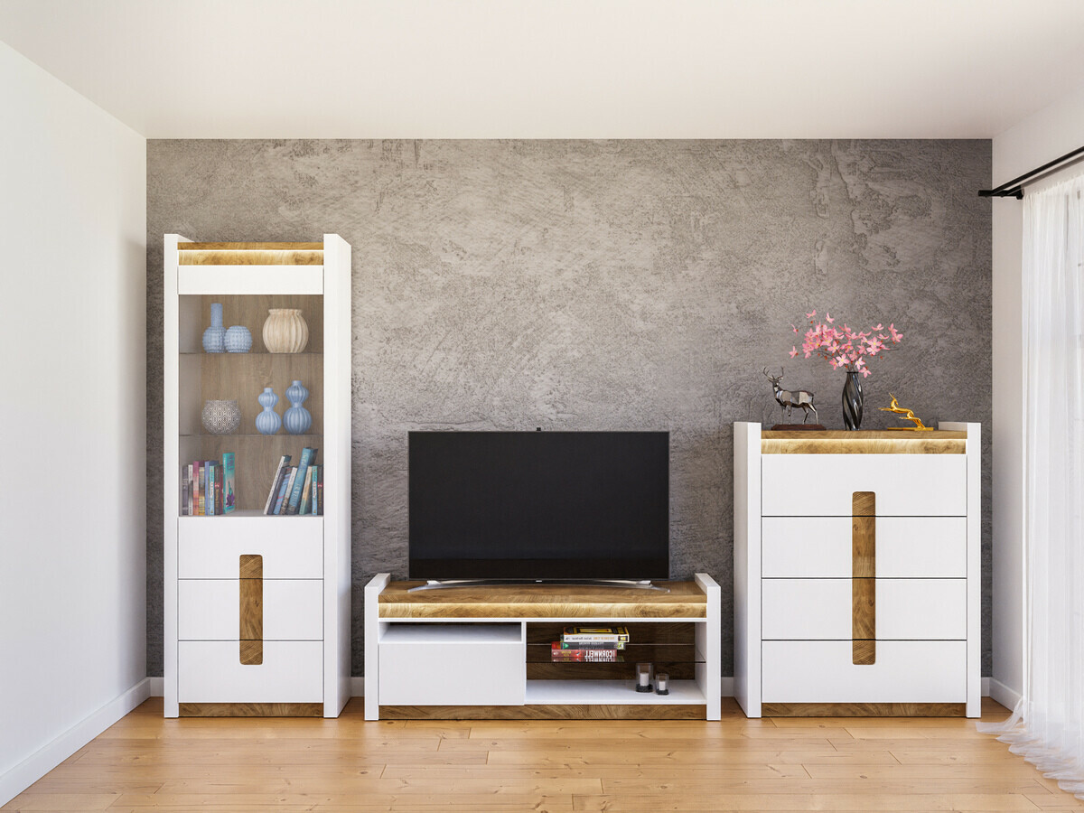 Bij het installeren van het interieur van het huis, is een belangrijke stap om te beslissen welke stemming we willen creëren. Besteed aandacht aan de kleur: lichte kleuren zullen de ruimte optisch vergroten, donkere kleuren zullen het tegenovergestelde doen, verkleinen. Houtkleurige details geven comfort en zien er geweldig uit in het interieur. Deze meubelcollectie is uniek omdat ze een ruime keuze aan meubelmodellen biedt voor verschillende woonruimtes. Creëer een solide interieur in zowel de woonkamer als de slaapkamer. Wat als de meubels ook in de gang passen? Of in het kantoor? Dat is allemaal mogelijk met deze collectie. Het lichte kleurenpalet komt zowel in kleine als grote ruimtes goed tot zijn recht. De gevels van de meubels worden gedomineerd door glanzend wit, dat perfect wordt aangevuld met houtkleurige details. De kleur en de patronen van het hout komen prachtig tot uiting in de meubilairtafels, wat een gevoel van gezelligheid geeft. Ook de greepoplossing springt in het oog, die niet alleen past als handvat, maar ook als decoratief detail. Er zal zeker genoeg ruimte zijn om spullen op te bergen, het meubel heeft voldoende laden en planken. Voor extra charme zorgt de geïntegreerde energiebesparende LED-verlichting. Deze oplossing zal u laten genieten van een gezellig licht dat de houtkleurige inzetstukken zal benadrukken. Het geruisloze sluitmechanisme zal ervoor zorgen dat de deuren en laden niet snel dichtvallen.