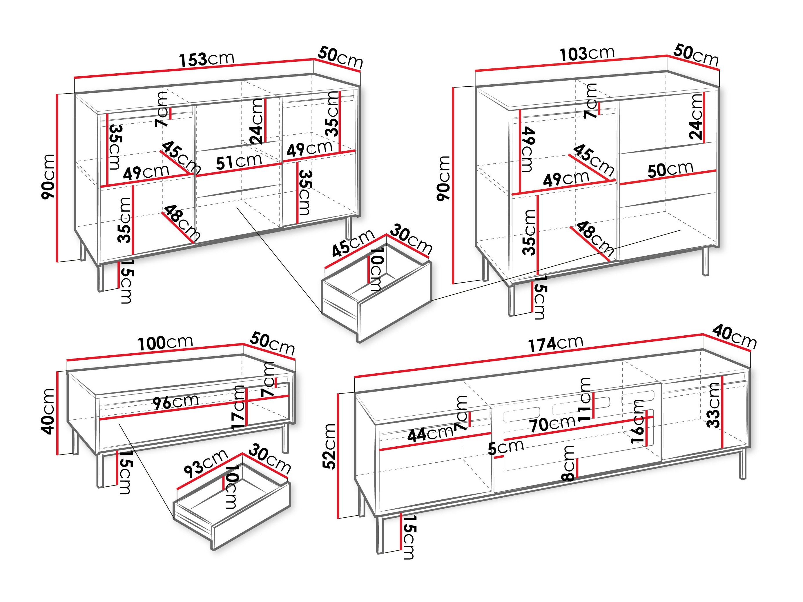 90 x 153 x 50; 90 x 103 x 50 cm