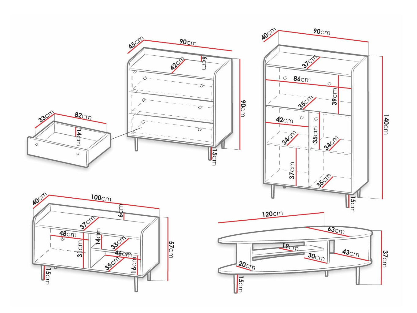 De meubels zijn gemaakt van gelamineerde spaanplaten, waarvan de randen zijn beschermd met speciale ABS-tape. Door de hoogwaardige ABS randen zijn de meubels beter bestand tegen stoten. De deuren en laden hebben een geruisloos sluitmechanisme, waardoor de laden en deuren gemakkelijk en zonder lawaai sluiten. De fronten van de meubelen zijn versierd met kleine zwarte metalen handgrepen, die passen bij de meubelen van deze elegante collectie. Sierlijke metalen poten voegen originaliteit en stijl toe aan onregelmatig gevormde meubels.