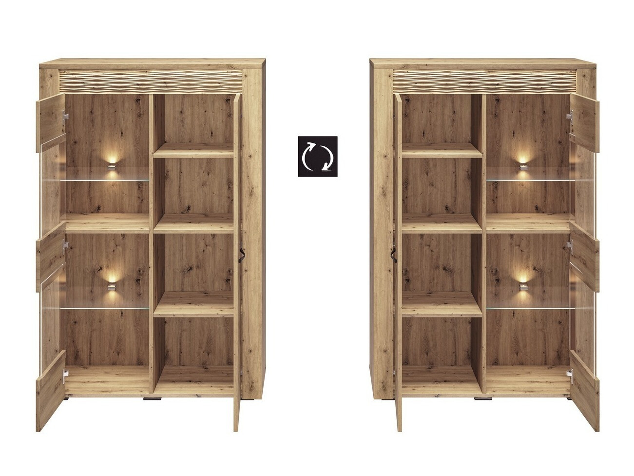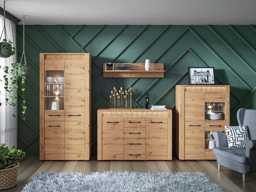 We beginnen gezellige momenten thuis steeds meer te waarderen. Thuis wordt een plek voor rust, werk en ontspanning. De op de natuur geïnspireerde collectie ziet er aantrekkelijk uit met de natuurlijke kleuren en details. Deze collectie is perfect voor wie meer gezelligheid in huis wil creëren. Eenvoudige lijnen en een eikenhouten kleur vormen een exclusief duo. Misschien is deze collectie waar je naar op zoek bent? De gevels van de meubels zijn bedrukt met houten patronen, die de collectie uniek maken. De metalen handgrepen benadrukken het exclusieve ontwerp van de meubels. De decoratieve ornamenten geven het extra karakter, die worden geaccentueerd door LED-verlichting die in de gevels van de meubels is ingebouwd. Ook voor de vitrines heb je LED-verlichting als optie, waardoor de details van het interieur worden benadrukt. "Artisan" eiken gevels, gehard glas, LED-verlichting en metalen handgrepen maken de collectie uniek. Alles wordt gevormd door de perfect benutte ruimte in de meubels. Zo kun je al je belangrijkste spullen netjes opbergen.