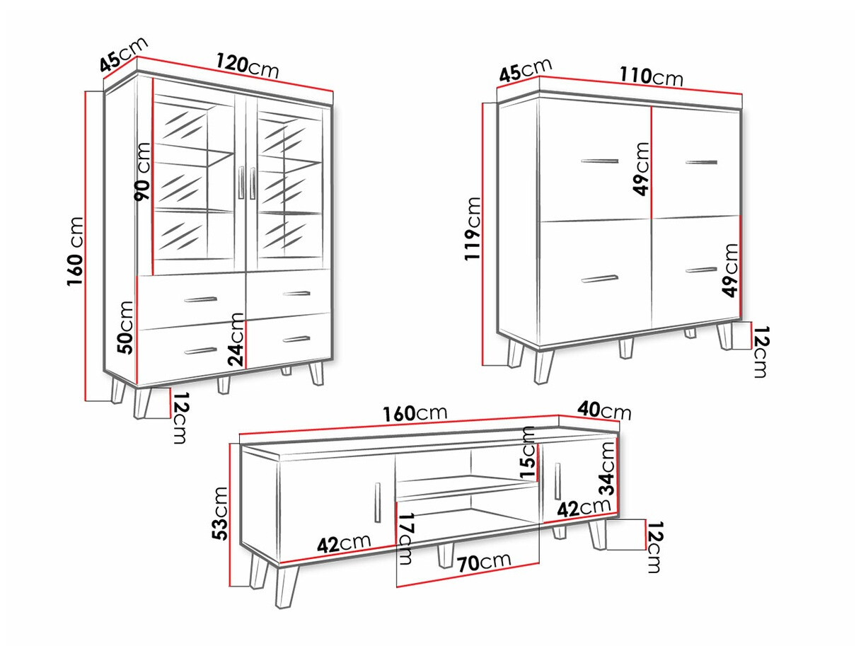Je herkent de scandinavische kenmerken van de meubelcollectie al van verre - eenvoud, minimalisme en natuurlijkheid. De meubels in deze collectie zijn ontworpen met het oog op dagelijks comfort, dus het ontwerp is gebaseerd op alledaagse benodigdheden: ruime planken en laden, ruime gesloten kasten. Alle meubels zijn gemonteerd op poten van 12 cm, die elk van hen een optische indruk van lichtheid geven, terwijl de langwerpige handgrepen het minimalistische ontwerp versterken. De meubels zijn vol van nordic esthetiek, ook is het perfect aangepast aan moderne elementen zoals volledig glazen vitrine planken, die gerechten of familie souvenirs kunnen houden. De kleuren van de gevels geven harmonie en gezelligheid aan het interieur van de woonkamer. De meubelen uit de collectie zijn verkrijgbaar in verschillende kleuren: "Wotan" eiken met wit of wit met lichte eiken accenten. De collectie omvat alle essentiële meubels voor de woonkamer: salon- en tv-tafels, commode, kast, vitrine en kast.
