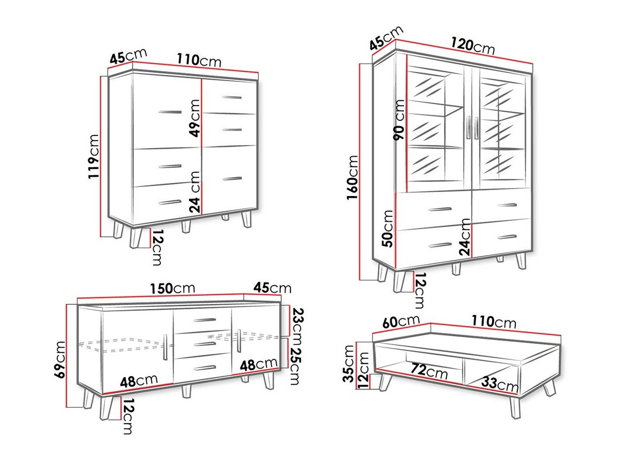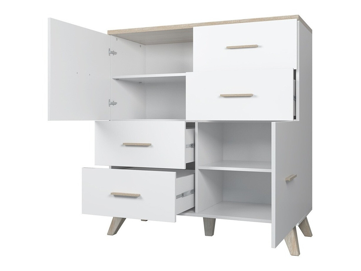 Je herkent de scandinavische kenmerken van de meubelcollectie al van verre - eenvoud, minimalisme en natuurlijkheid. De meubels in deze collectie zijn ontworpen met het oog op dagelijks comfort, dus het ontwerp is gebaseerd op alledaagse benodigdheden: ruime planken en laden, ruime gesloten kasten. Alle meubels zijn gemonteerd op poten van 12 cm, die elk van hen een optische indruk van lichtheid geven, terwijl de langwerpige handgrepen het minimalistische ontwerp versterken. De meubels zijn vol van nordic esthetiek, ook is het perfect aangepast aan moderne elementen zoals volledig glazen vitrine planken, die gerechten of familie souvenirs kunnen houden. De kleuren van de gevels geven harmonie en gezelligheid aan het interieur van de woonkamer. De meubelen uit de collectie zijn verkrijgbaar in verschillende kleuren: "Wotan" eiken met wit of wit met lichte eiken accenten. De collectie omvat alle essentiële meubels voor de woonkamer: salon- en tv-tafels, commode, kast, vitrine en kast.