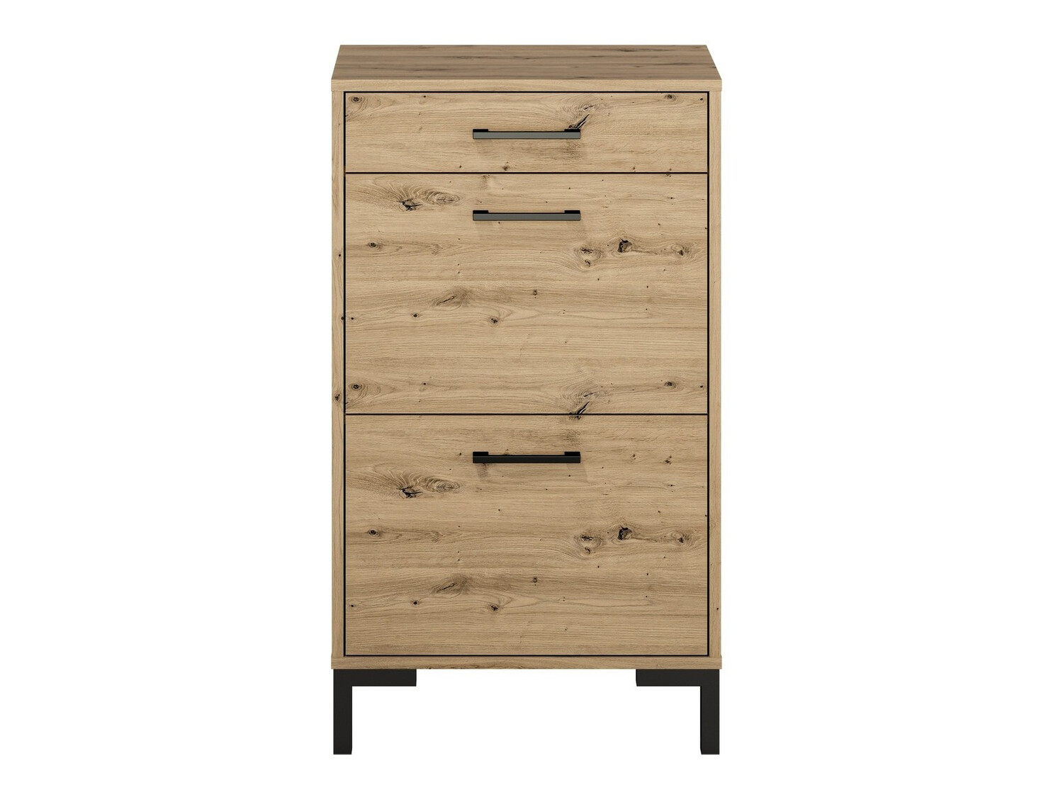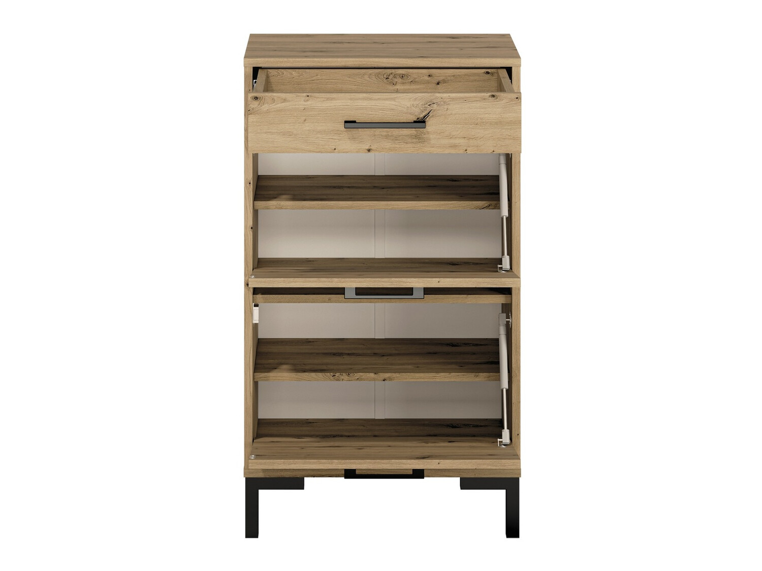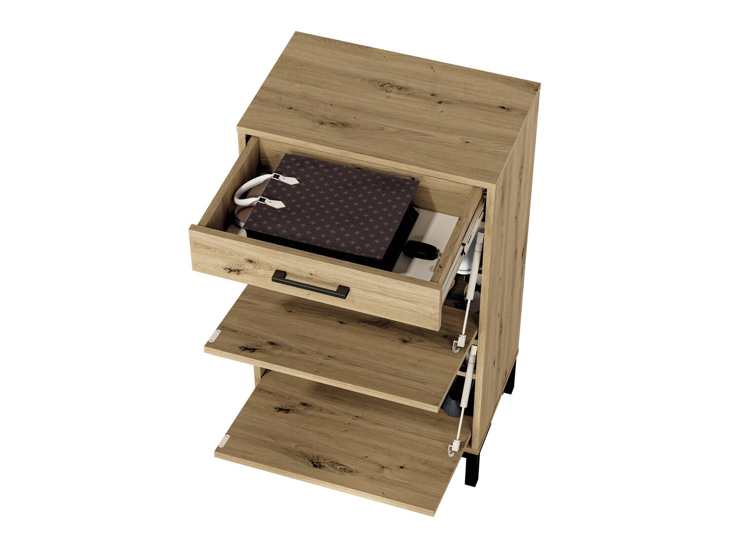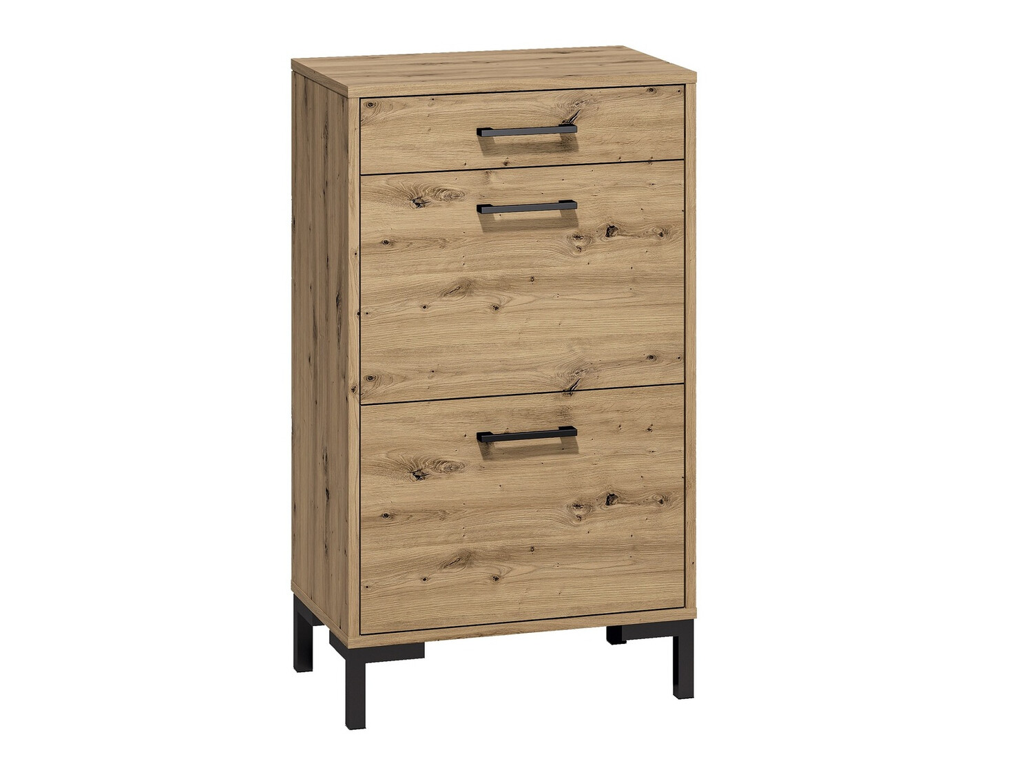 Vaak krijgt de hal minder aandacht dan andere ruimtes in huis. Maar het is een ruimte waar we gasten ontmoeten en de eerste ruimte die we betreden als we thuiskomen. Het is als het gezicht van een huis. Creëer een stijlvolle en functionele hal en maak er een gezellig hoekje van het huis van. Het belangrijkste kenmerk van de collectie is de warme kleur van "Artisan" eikenhout en de heldere, strakke lijnen. Houtpatern geeft extra karakter aan meubels. De zwarte poten en handgrepen passen goed bij de houtkleurige gevels en creëren een moderne designstemming. Deze meubelen zullen zowel in een donker als in een licht interieur goed tot hun recht komen. Functionaliteit is ook een van de belangrijkste aspecten van een woning. Kies uit losse meubels of sets en hou weer van de gangruimte!