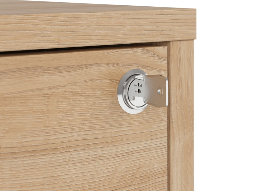 Als je op zoek bent naar meubilair voor een functioneel kantoor - dan is deze collectie voor jou bedoeld. De "Artisan" eiken en zwarte kleurencombinatie voegen moderniteit toe aan het meubilair. De minimalistische zwarte kunststof handgrepen passen perfect in het ontwerp. De meubels in de collectie zijn gemaakt van gelamineerde spaanplaat met een krasbestendig oppervlak. Door deze beschermlaag zijn de meubels niet alleen bestand tegen krassen, maar ook beter beschermd tegen vocht of vlekken. Het in de meubelen ingebouwde geruisloze sluitmechanisme zal de gebruikerservaring verder verbeteren en zorgen voor het geruisloos openen en sluiten van deuren en laden. Het meubel heeft zowel open als gesloten opbergruimtes. Hierdoor kunnen persoonlijke bezittingen worden opgeborgen op zichtbare planken of verborgen achter deuren. De collectie maakt gebruik van warmtebehandeld, gehard matglas. De weerstand ervan is 5-6 keer hoger dan die van gewoon, thermisch onbehandeld glas. Het glas wordt gevormd door een zwart aluminium frame. De planken van de collectie zijn universeel. Tijdens de montage kan worden bepaald in welke richting de deur wordt geopend. De ladeblokken hebben wieltjes in plaats van poten, waardoor het verplaatsen van meubels in de kamer zeer eenvoudig en gemakkelijk wordt. De lock-in planken zorgen ervoor dat persoonlijke spullen nog veiliger kunnen worden opgeborgen. De basis van de bureaus van de collectie is gemaakt van een zwart metalen frame dat voor stabiliteit zorgt. Voor wie een functioneel bureau zoekt, biedt de collectie bureaus met een elektrisch hoogte verstelmechanisme. Met behulp van een paar knoppen verandert de hoogte van de tafel, zodat je nog comfortabeler en ergonomischer je werk kunt doen. Met functionele en universele meubels wordt het inrichten van een kantoorruimte een plezier.