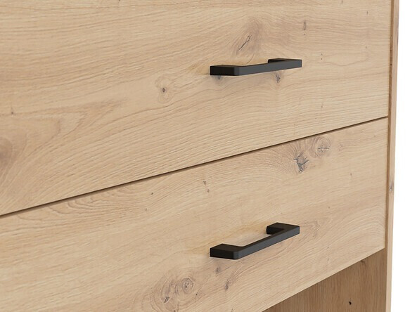 Als je op zoek bent naar meubilair voor een functioneel kantoor - dan is deze collectie voor jou bedoeld. De "Artisan" eiken en zwarte kleurencombinatie voegen moderniteit toe aan het meubilair. De minimalistische zwarte kunststof handgrepen passen perfect in het ontwerp. De meubels in de collectie zijn gemaakt van gelamineerde spaanplaat met een krasbestendig oppervlak. Door deze beschermlaag zijn de meubels niet alleen bestand tegen krassen, maar ook beter beschermd tegen vocht of vlekken. Het in de meubelen ingebouwde geruisloze sluitmechanisme zal de gebruikerservaring verder verbeteren en zorgen voor het geruisloos openen en sluiten van deuren en laden. Het meubel heeft zowel open als gesloten opbergruimtes. Hierdoor kunnen persoonlijke bezittingen worden opgeborgen op zichtbare planken of verborgen achter deuren. De collectie maakt gebruik van warmtebehandeld, gehard matglas. De weerstand ervan is 5-6 keer hoger dan die van gewoon, thermisch onbehandeld glas. Het glas wordt gevormd door een zwart aluminium frame. De planken van de collectie zijn universeel. Tijdens de montage kan worden bepaald in welke richting de deur wordt geopend. De ladeblokken hebben wieltjes in plaats van poten, waardoor het verplaatsen van meubels in de kamer zeer eenvoudig en gemakkelijk wordt. De lock-in planken zorgen ervoor dat persoonlijke spullen nog veiliger kunnen worden opgeborgen. De basis van de bureaus van de collectie is gemaakt van een zwart metalen frame dat voor stabiliteit zorgt. Voor wie een functioneel bureau zoekt, biedt de collectie bureaus met een elektrisch hoogte verstelmechanisme. Met behulp van een paar knoppen verandert de hoogte van de tafel, zodat je nog comfortabeler en ergonomischer je werk kunt doen. Met functionele en universele meubels wordt het inrichten van een kantoorruimte een plezier.