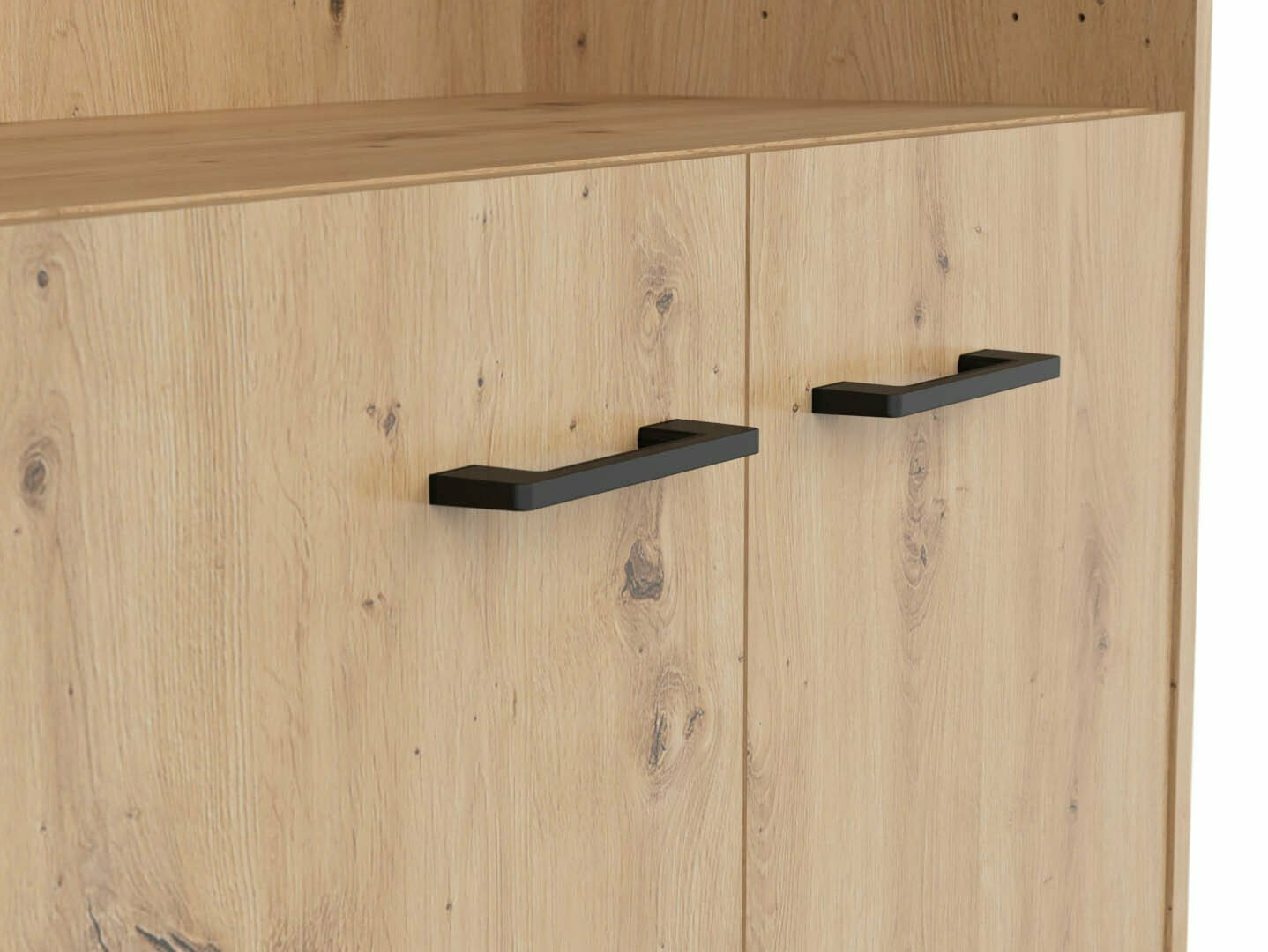 Als je op zoek bent naar meubilair voor een functioneel kantoor - dan is deze collectie voor jou bedoeld. De "Artisan" eiken en zwarte kleurencombinatie voegen moderniteit toe aan het meubilair. De minimalistische zwarte kunststof handgrepen passen perfect in het ontwerp. De meubels in de collectie zijn gemaakt van gelamineerde spaanplaat met een krasbestendig oppervlak. Door deze beschermlaag zijn de meubels niet alleen bestand tegen krassen, maar ook beter beschermd tegen vocht of vlekken. Het in de meubelen ingebouwde geruisloze sluitmechanisme zal de gebruikerservaring verder verbeteren en zorgen voor het geruisloos openen en sluiten van deuren en laden. Het meubel heeft zowel open als gesloten opbergruimtes. Hierdoor kunnen persoonlijke bezittingen worden opgeborgen op zichtbare planken of verborgen achter deuren. De collectie maakt gebruik van warmtebehandeld, gehard matglas. De weerstand ervan is 5-6 keer hoger dan die van gewoon, thermisch onbehandeld glas. Het glas wordt gevormd door een zwart aluminium frame. De planken van de collectie zijn universeel. Tijdens de montage kan worden bepaald in welke richting de deur wordt geopend. De ladeblokken hebben wieltjes in plaats van poten, waardoor het verplaatsen van meubels in de kamer zeer eenvoudig en gemakkelijk wordt. De lock-in planken zorgen ervoor dat persoonlijke spullen nog veiliger kunnen worden opgeborgen. De basis van de bureaus van de collectie is gemaakt van een zwart metalen frame dat voor stabiliteit zorgt. Voor wie een functioneel bureau zoekt, biedt de collectie bureaus met een elektrisch hoogte verstelmechanisme. Met behulp van een paar knoppen verandert de hoogte van de tafel, zodat je nog comfortabeler en ergonomischer je werk kunt doen. Met functionele en universele meubels wordt het inrichten van een kantoorruimte een plezier.