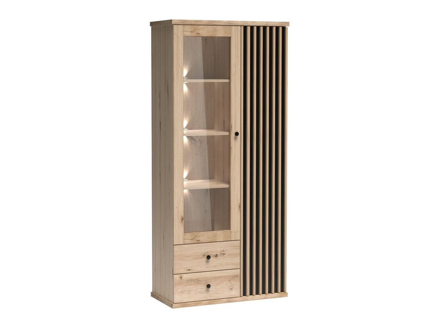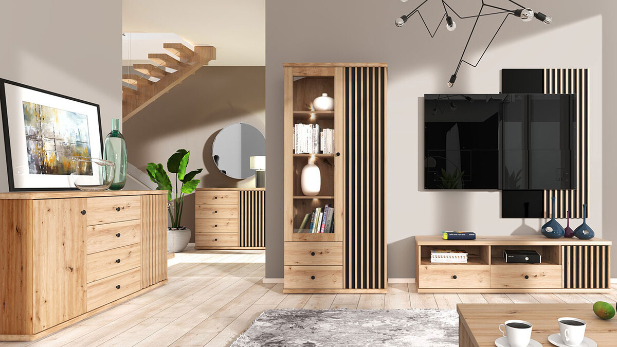 Als u bedenkt hoe een perfecte woonkamer eruit moet zien, is het de moeite waard om de sectie meubelcollecties te bekijken en ideeën op te doen. Als u een gezellige woonkamer wilt creëren, aangevuld met moderne designdetails, dan is deze collectie precies dat. De "Artisan" eikenkleur domineert in de collectie en op de fronten zijn hints van houtpatroon te zien. Kleine zwarte metalen handgrepen passen perfect in het hele ontwerp. Decoratieve verticale lijnen worden een accent van de collectie. Deze oplossing geeft de meubels een exclusief karakter en vervangt tevens de meubelgrepen, waardoor de meubeldeuren kunnen worden geopend. In de meubels ontbreken geen planken en laden, die helpen om de belangrijkste dingen op te bergen. In de meubelen is een stil sluitmechanisme ingebouwd, dat bijzonder is omdat het voorkomt dat deuren en laden snel sluiten. Dankzij speciale dempers worden de deuren en laden vlak voor het sluiten gestopt en langzaam ingetrokken zonder lawaai te maken. Van een kast tot een vitrine, van een tv-tafel tot een hangplank, in deze collectie vindt u diverse meubels voor de woonkamer. Wil je zonder veel moeite een compleet interieur creëren, kies dan voor een meubelset.